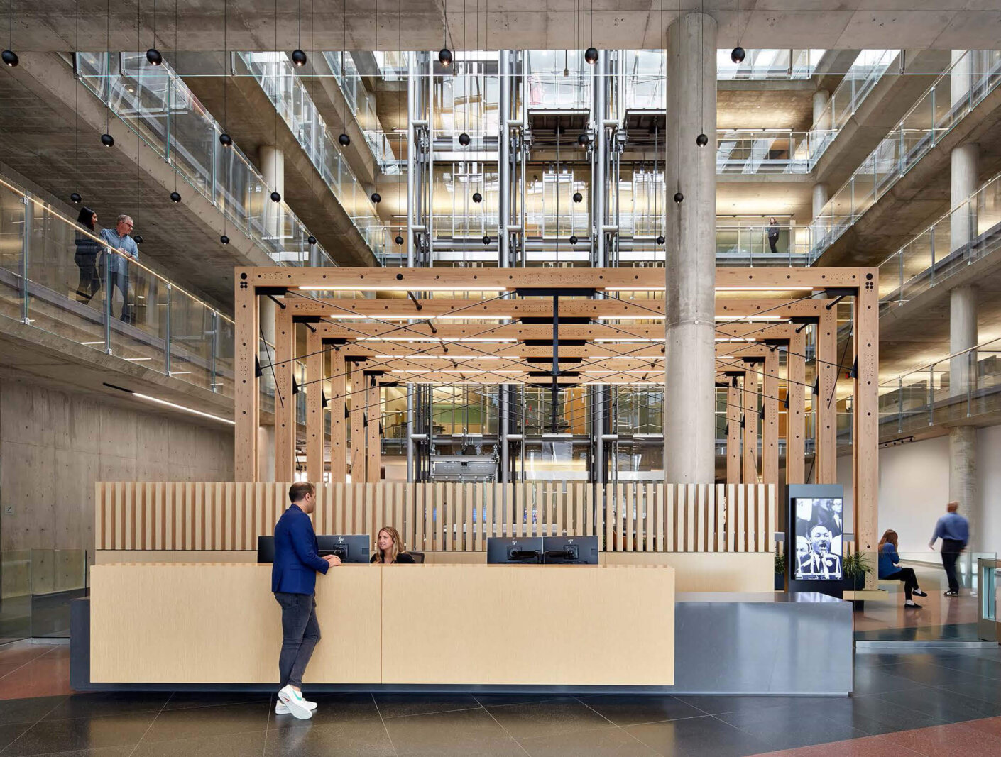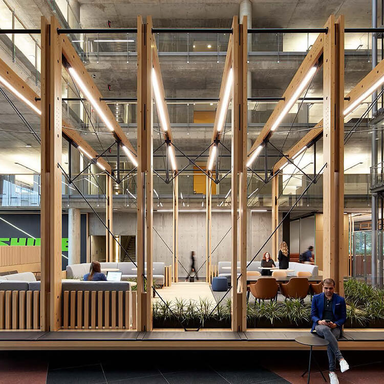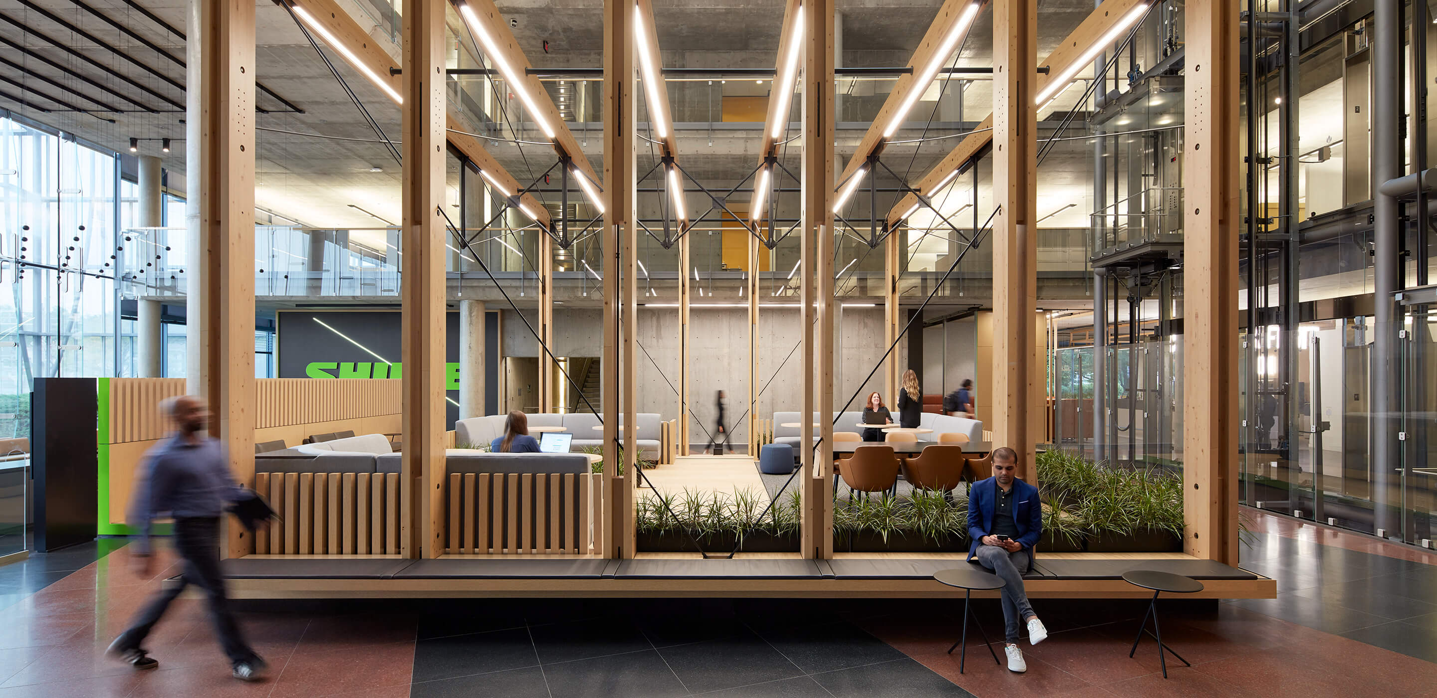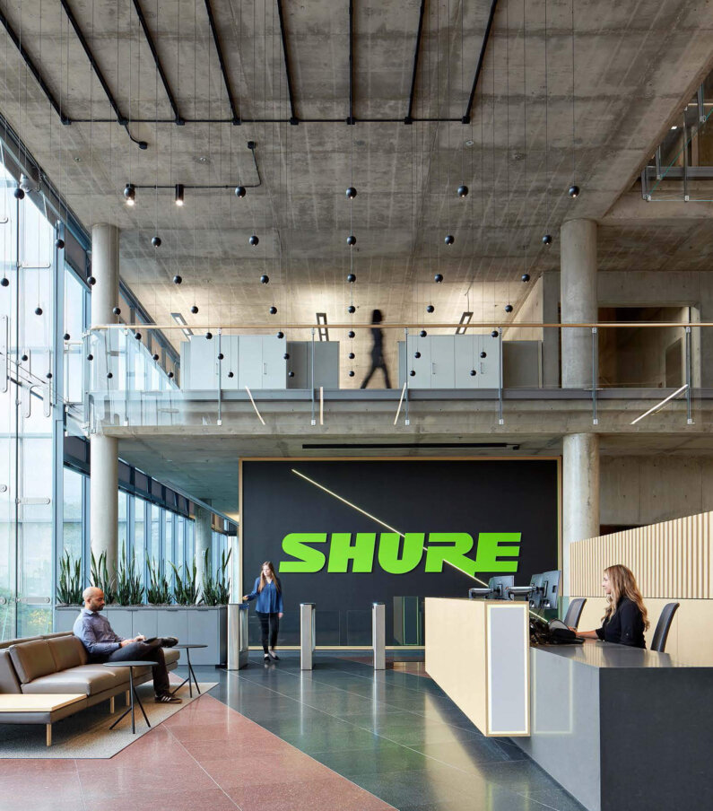 Strong brand color and lighting create drama, the glulam wood and steel pavilion and biophilia introduces warmth and texture bringing human scale to the grand seven story atrium. Like the assembly of Shure’s products, materials are beautiful, functional, and well crafted.