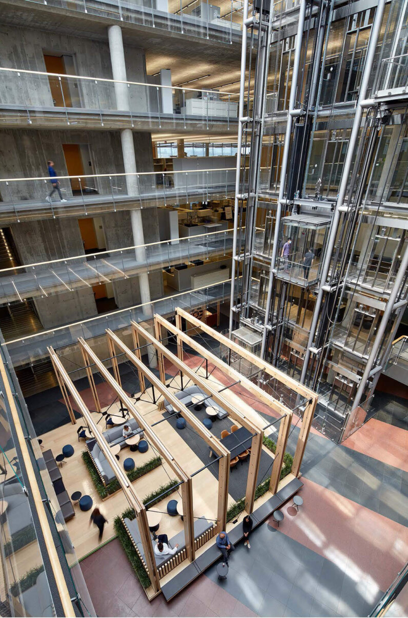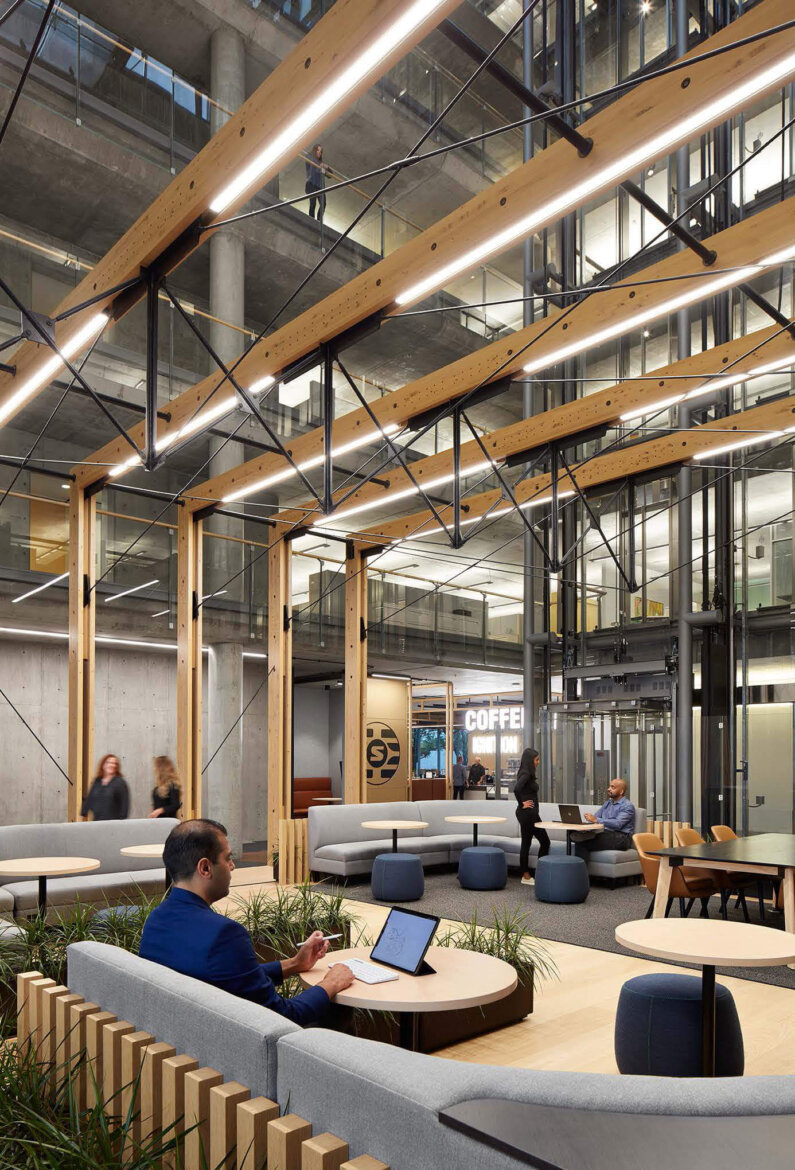 Within the pavilion and Sidney’s Café – named after founder Sidney Shure – the space types vary from larger group meeting space to single heads down quiet booths. The café opens to a grassy area outside, where Associates (many of them musical artists) entertain with live music.