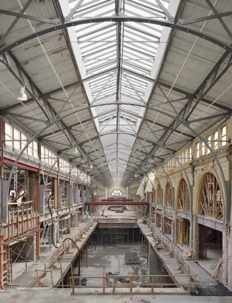 Fortunately, the midcentury renovation had left intact portions of the nave’s brick arcade, albeit with the arched windows infilled with drywall. Rebuilding the arches in brick and the geometric window mullions in wood was ideal, but economically untenable. Instead, we completed the arcade with 22-foot-tall glass fiber panels cast from a mold of a surviving arch, and brush-painted aluminum window mullions to create a woodlike texture. Where the mosaic tile floors had been removed or damaged over time, we used material salvaged from the second-floor cutouts. We also restored the grand arcade of metal trusses spanning the nave.
