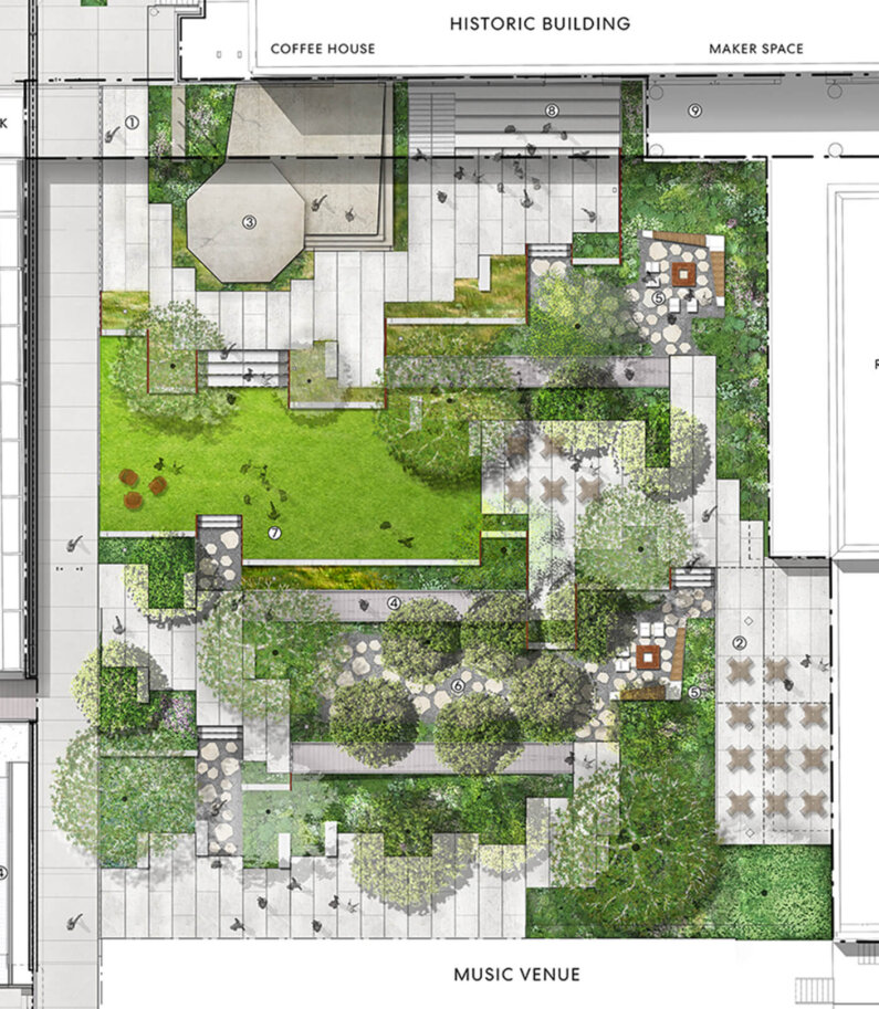 Framing the plaza is the historic building, now with a second-story addition, a brand-new office building, and a 2,200-seat music venue. The play of vintage and contemporary facades is a nod to the layered history the client was determined to preserve in this legacy space for the city.