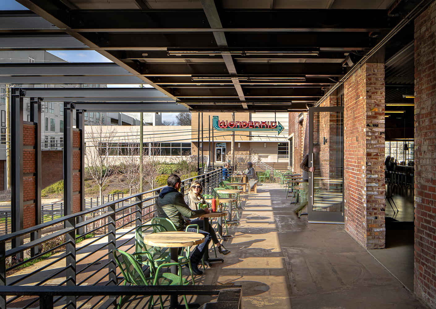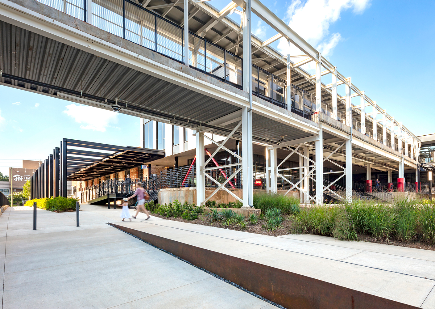 Along with its historic building, the original factory’s docks and network of catwalks were restored to make seamless transitions for people entering from the Eastside Trail up the street. Drawn to the vintage Dairies sign, walkers and cyclists can slip right into a sweet urban plaza that captures the neighborhood’s energy within a pocket-park experience.