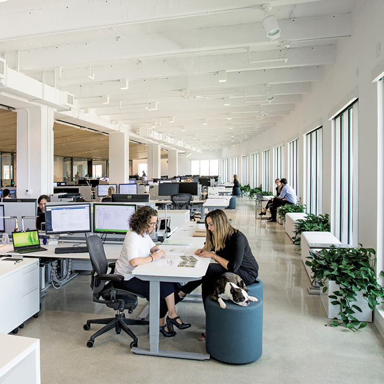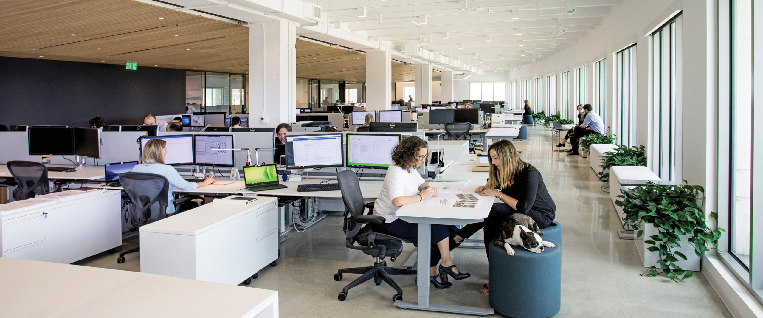 Air cleaning plants, Golden Pothos, were selected to grow and be trained vertically to create the indoor garden, a Living Lab, Helping to create a strong connection with Nature. Project based teams re-configure the flexible furniture on casters and are able to swivel the sit-to-stand desks as they choose.
