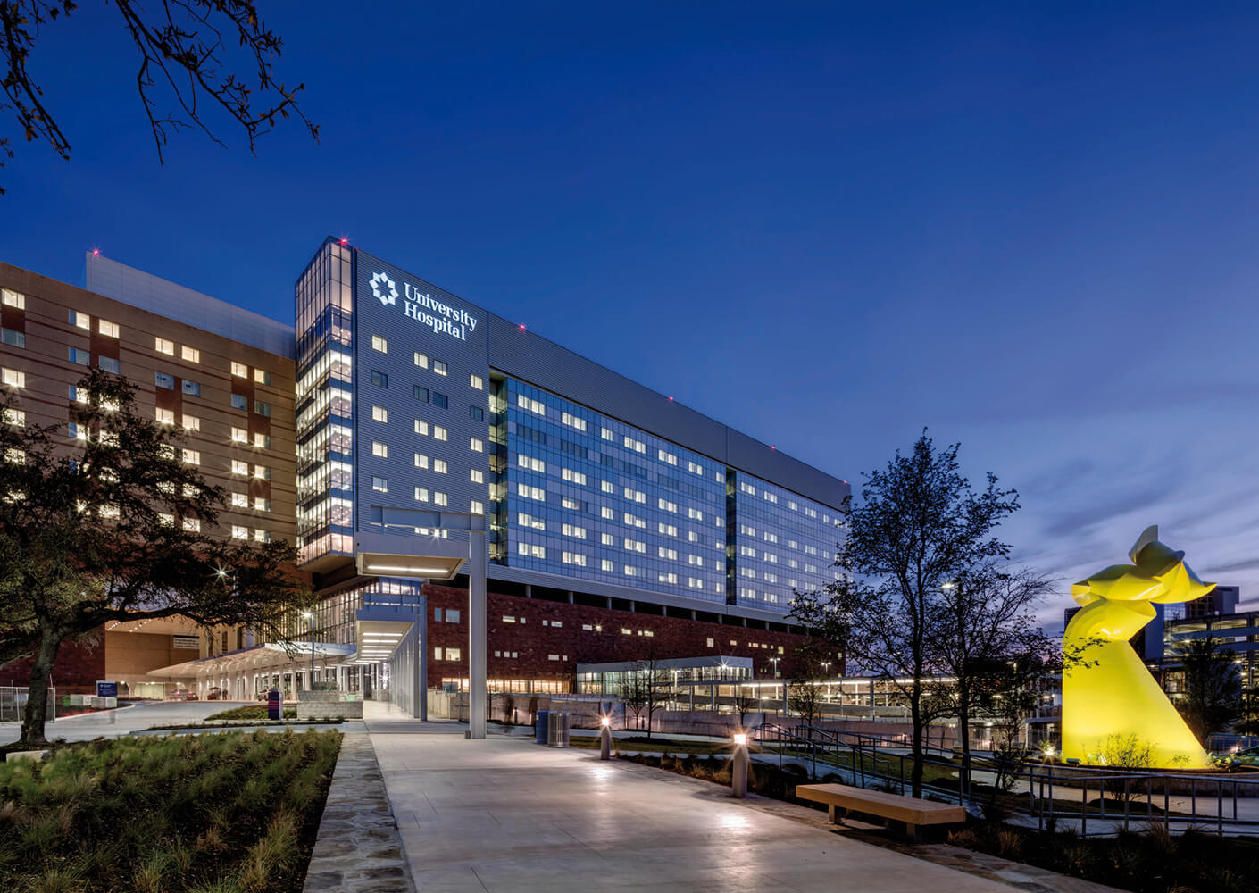 The University Health Sky Tower represents a new era of patient-centered, technologically advanced care supplemented by healing works of art. It is also notable for its sustainability as one of only three hospitals in Texas of comparable size to earn LEED Gold.