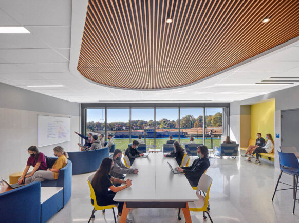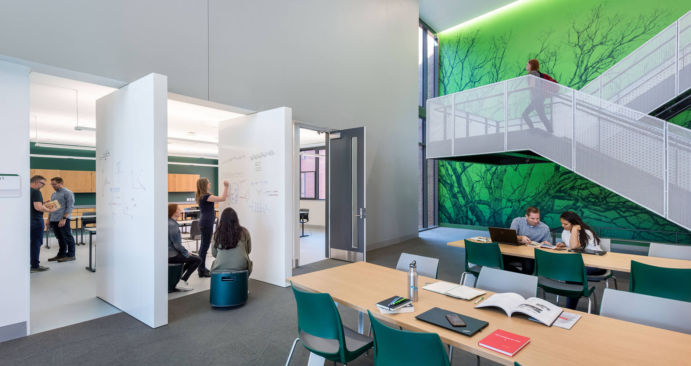 By colocating labs and universal classrooms around open flexible spaces, instructors in different departments are empowered to collaborate in small project-focused “town centers.”