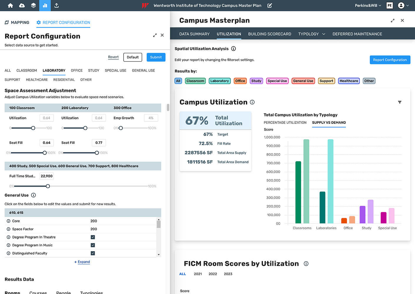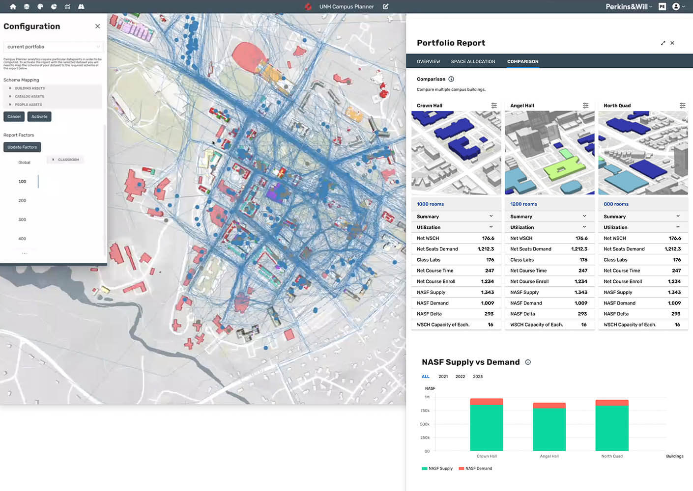Campus Planner is a tool developed by Perkins&Will that allows our design teams to synthesize large amounts of data (i.e. space utilization, course schedules, enrollments, GIS filters), and visualize it on a map. The mapping platform makes it easier to visualize the “full picture” of building assets, including their use and occupancy. This makes it possible to quickly understand opportunities for consolidating, repurposing, or removing buildings.