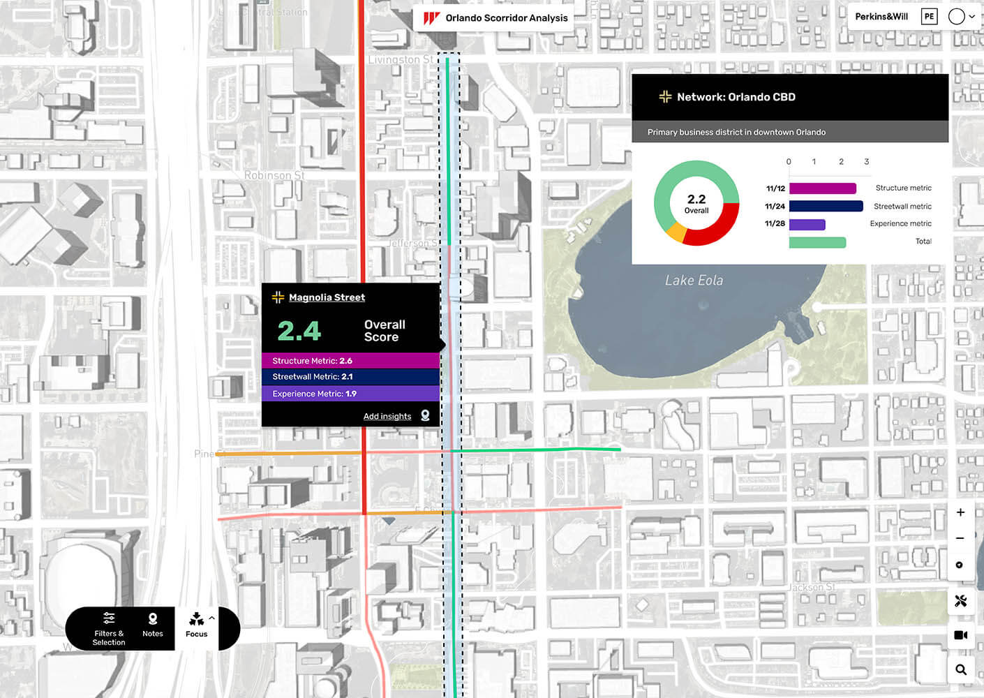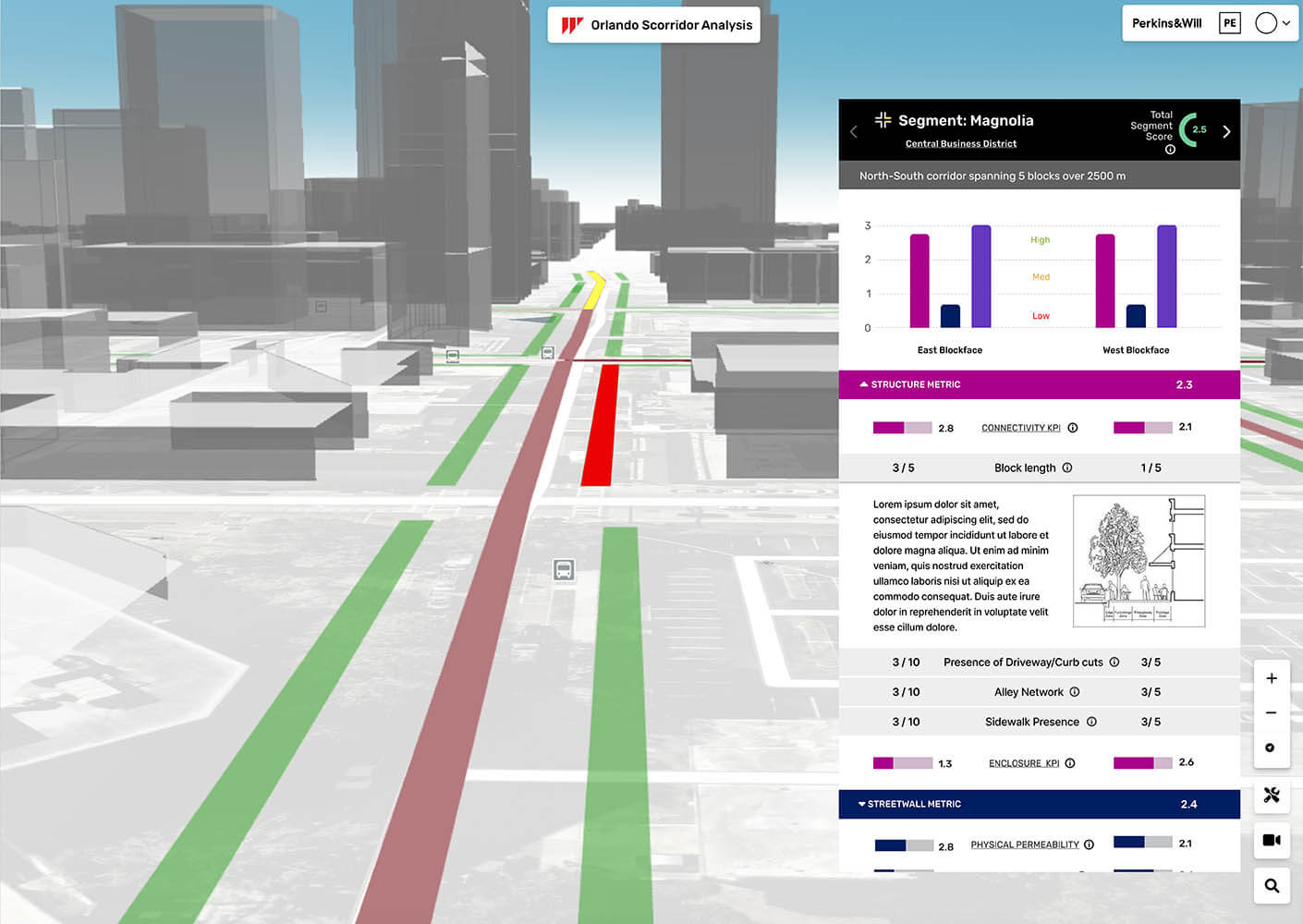 A vibrant public realm has a connected structure that encourages walkability, an active street wall edge that provides architectural interest and destinations, and a comfortable pedestrian experience that is enjoyable, exciting, and safe. StreetSeen provides reporting and scenario building tools based on spatial analytics, for a collection of measured data points. Each blockface is measured across dozens of indicators to create three metrics: structure, streetwall, and experience. Each metric combines for a corridor rating system based on peer reviewed processes, engineered by our urban designers and data scientists.