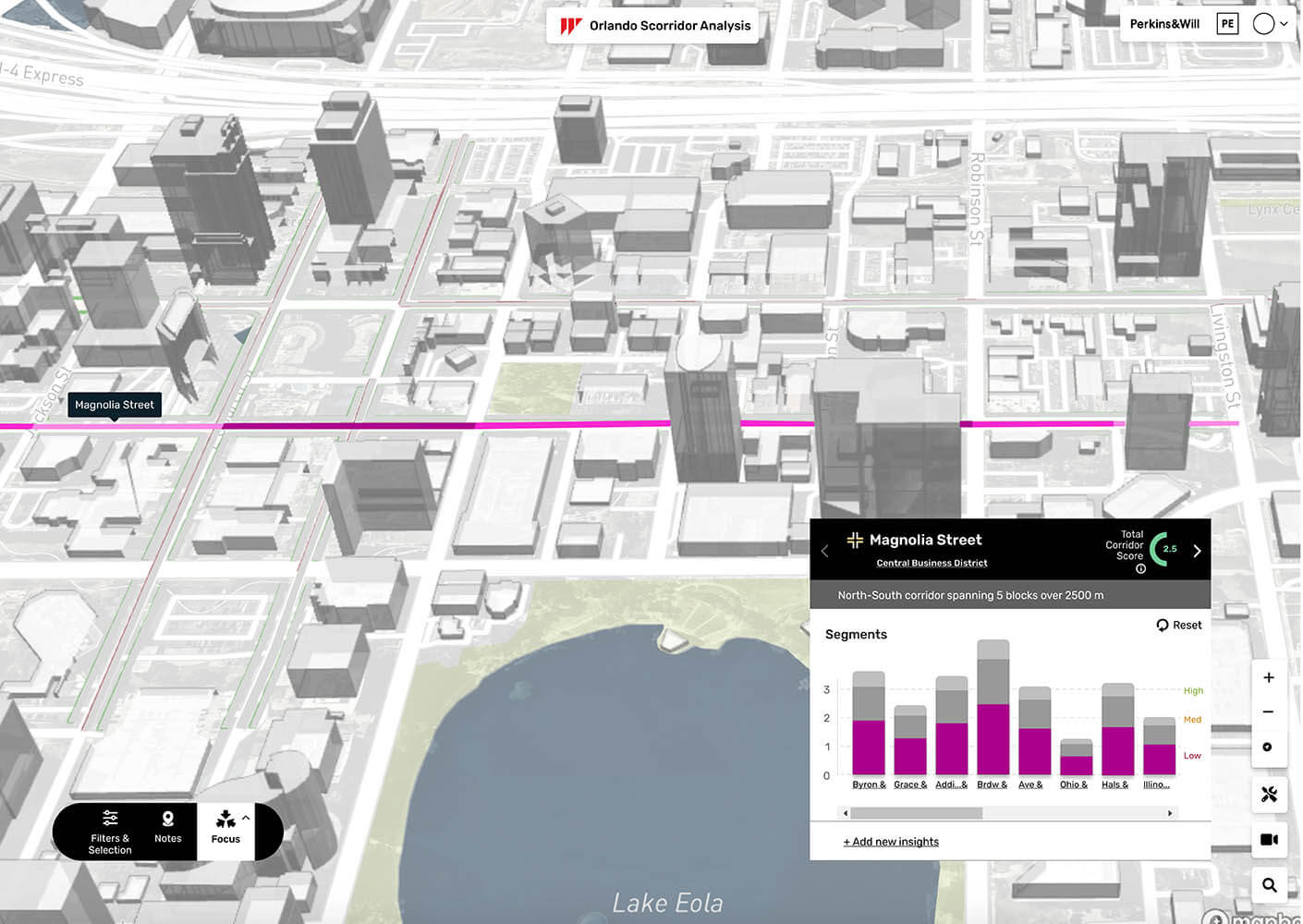 The tool’s visual format makes it is easy to work through multiple scenarios quickly, and in a way that university planners and leadership can easily understand. Because it’s tied to a GIS system, we can continue to add data to the campus map that helps inform different elements of master planning, like streets, buildings, or vegetation data. Because it’s live, we can plan in real-time. This planning tool is not a report collecting dust on a shelf. It’s dynamic and can be easily updated as data inputs change. Campus Planner allows teams to make decisions in real time, track projects, and benchmark against key performance metrics and targets.