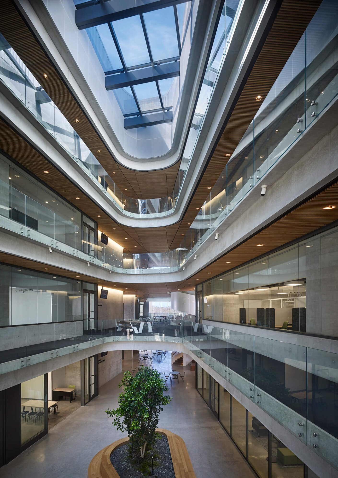 A deep, intimate connection between industry and academia is necessary to work together on future technologies, which is baked into the DNA of the Jacobs School. And all of that energy gets transferred throughout the building. No signage necessary, just stand in the middle of the atrium and see everything you can connect to.