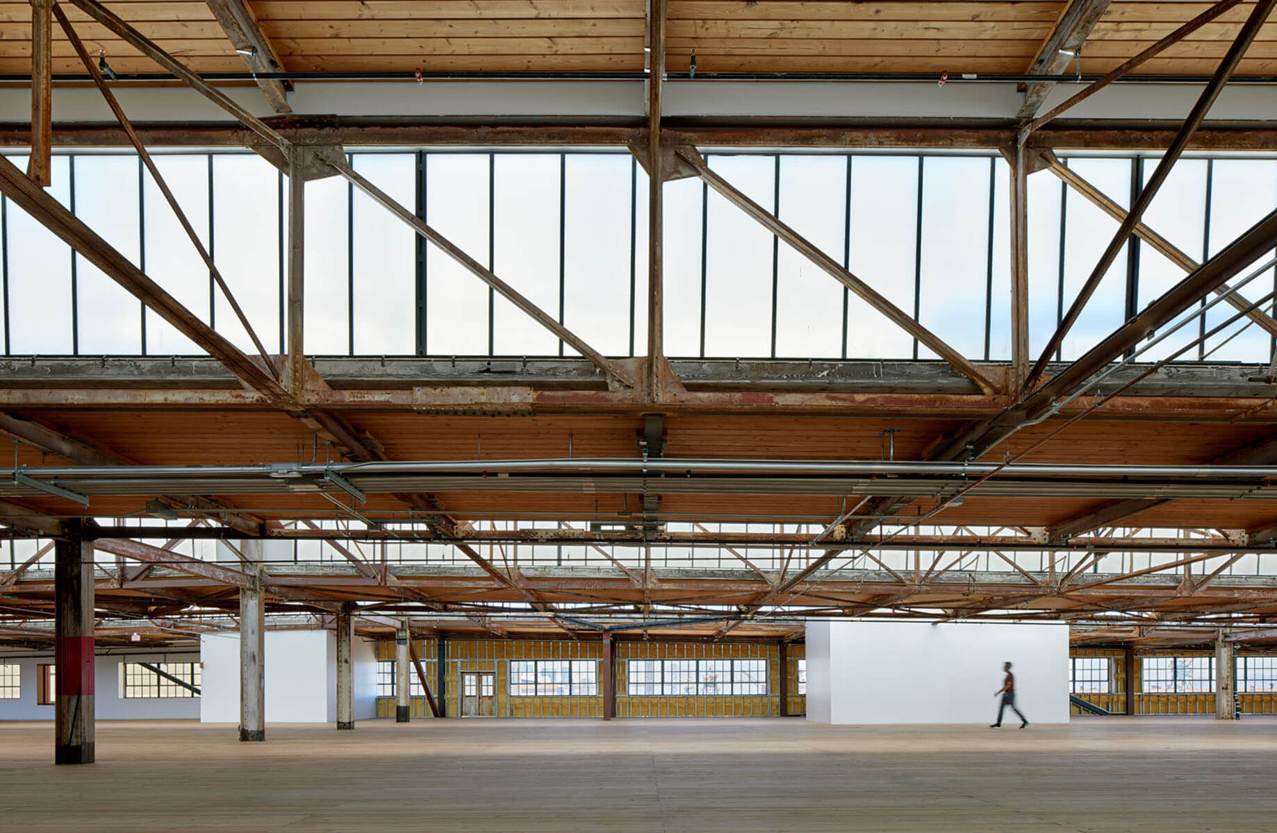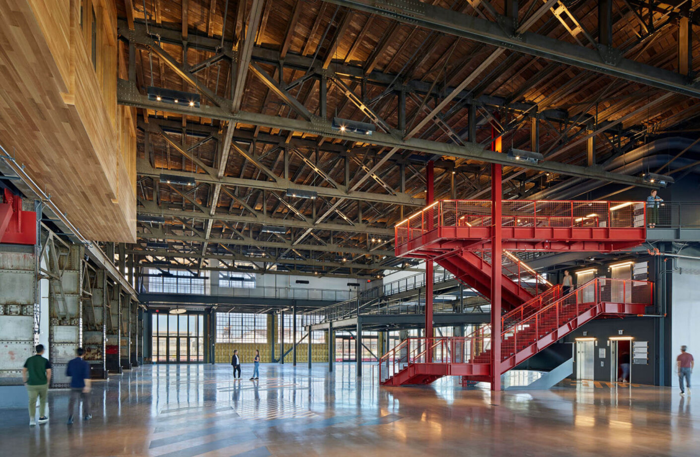 The renovation of Building 12 is envisioned as a vibrant community gathering and event space that is integral and connected to the landscape and overall site offering spectacular views of the San Francisco Bay and the city. The design of Building 12 welcomes visitors to the grand market hall via three colossal red portals and fully operable window walls along key facades to provide maximum porosity between the interior market hall and the surrounding pedestrian plazas and parks and the new Pier 70 neighborhood. While the ground floor Market Hall and new mezzanine are open to the public, the new second level will house artisan and maker studios and the former Mold Loft on the upper floor will be designed for workplace.