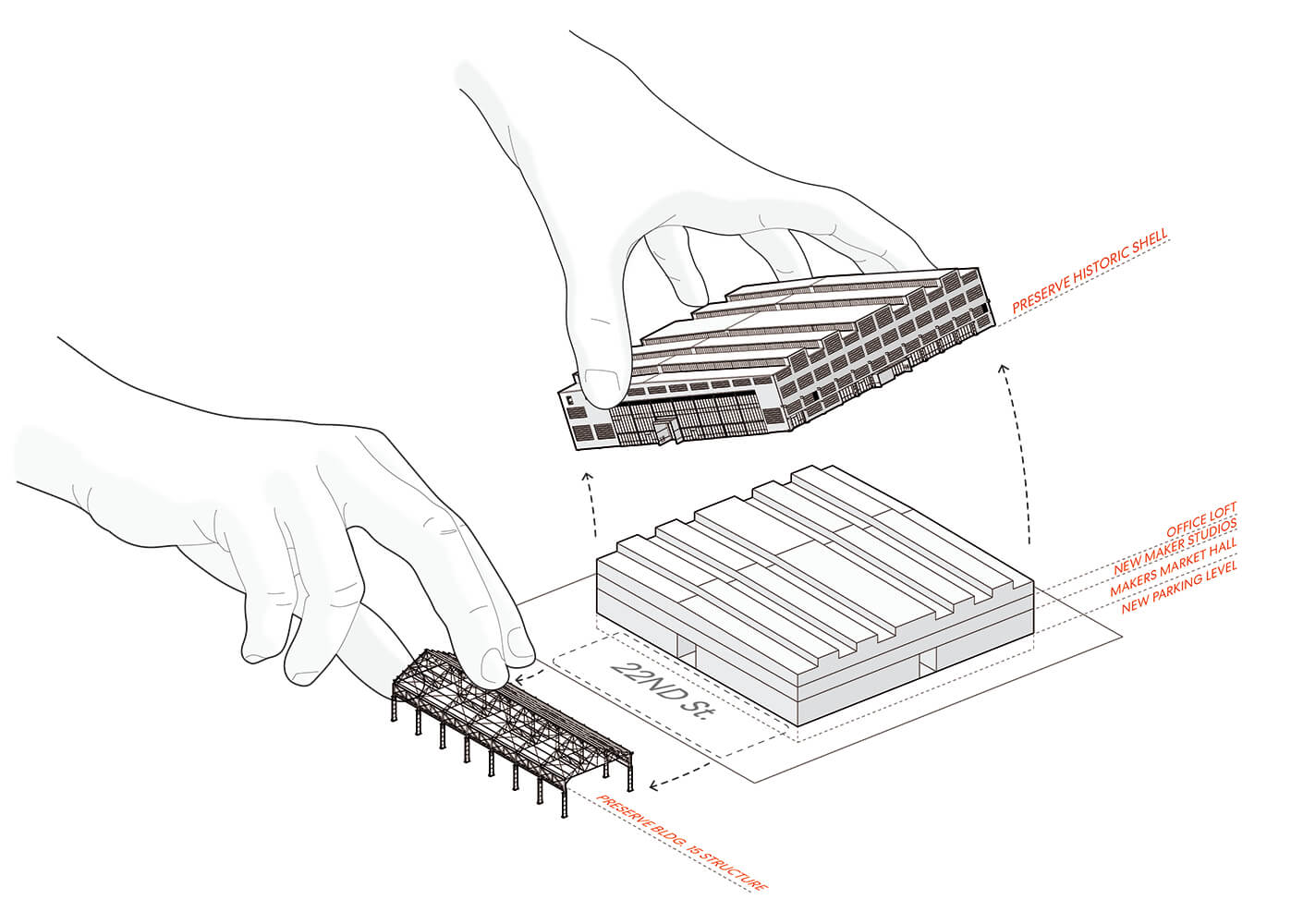 Heavy manufacturing and shipbuilding today will make way for creative light industrial maker space, office, and commerce. The large main volume where steel plates once were cut into ship hulls, will now be a grand maker’s market hall. The raised platform on the north side of Building 12 will provide visitors with views of the bay, where a new system of parks will open up the waterfront again.